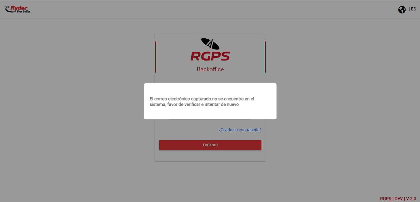 Al dar clic en el botón [Entrar] se mostrará el siguiente mensaje: “El correo electrónico capturado no se encuentra en el sistema, favor de verificar e intentar de nuevo”, el mensaje desaparecerá de manera automática tras haber transcurrido un par de segundos y el usuario permanecerá en la pantalla principal del sistema RGPS BackOffice mostrándose los campos capturados.