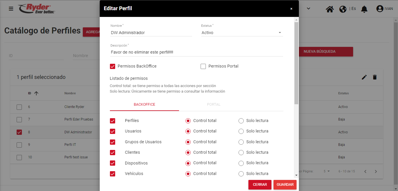 • No se encuentre un perfil ya registrado con el mismo nombre capturado que se está intentando guardar.