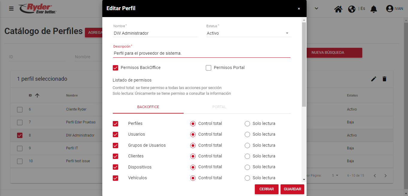 En caso de que no se deseé concluir con la edición del perfil seleccionado, el usuario deberá dar clic en el botón [Cerrar] y/o el icono “X” del modal “Editar perfil” y se cerrará el modal correspondiente, permaneciendo el usuario en la pantalla “Perfiles” en donde se visualizarán los resultados de la búsqueda aplicada junto con el registro seleccionado.