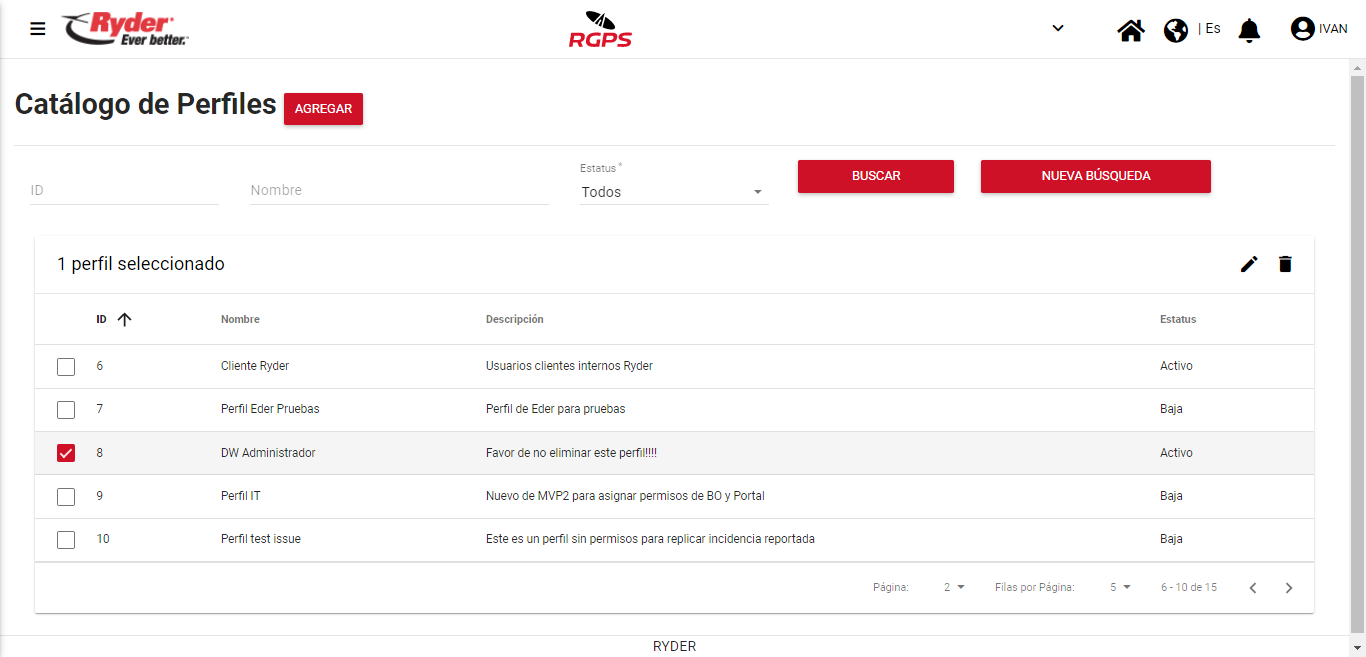 Al encontrarse en la pantalla “Catálogo de perfiles” y haber aplicado una búsqueda, el usuario deberá habilitar la casilla del registro de su interés y se mostrarán del lado derecho de la tabla los iconos: Editar y Eliminar.