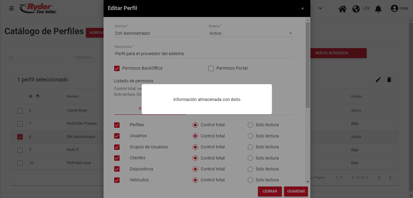 El mensaje desaparecerá de manera automática tras haber transcurrido un par de segundos y el usuario permanecerá en la pantalla “Catálogo de perfiles”, en donde ya no se mostrará seleccionado el registro y se visualizará las modificaciones realizadas si es que el dato que se editó se encuentra en las columnas del grid.