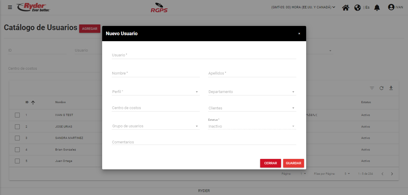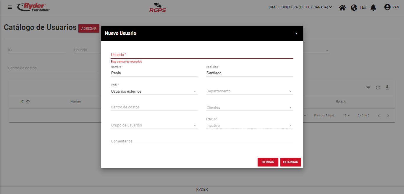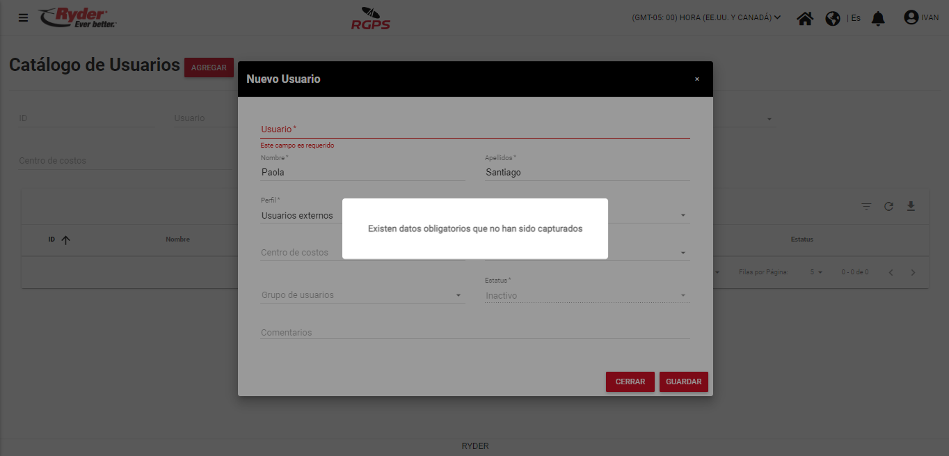 El mensaje desaparecerá de manera automática tras haber transcurrido un par de segundos y el usuario permanecerá en el modal “Nuevo Usuario”, en donde los campos vacíos se mostrarán de color rojo junto con la siguiente leyenda: “Este campo es requerido”.
