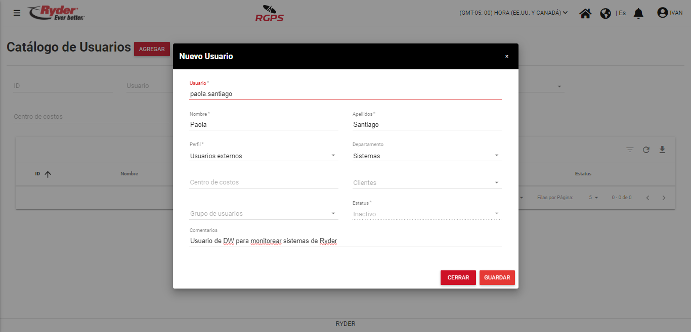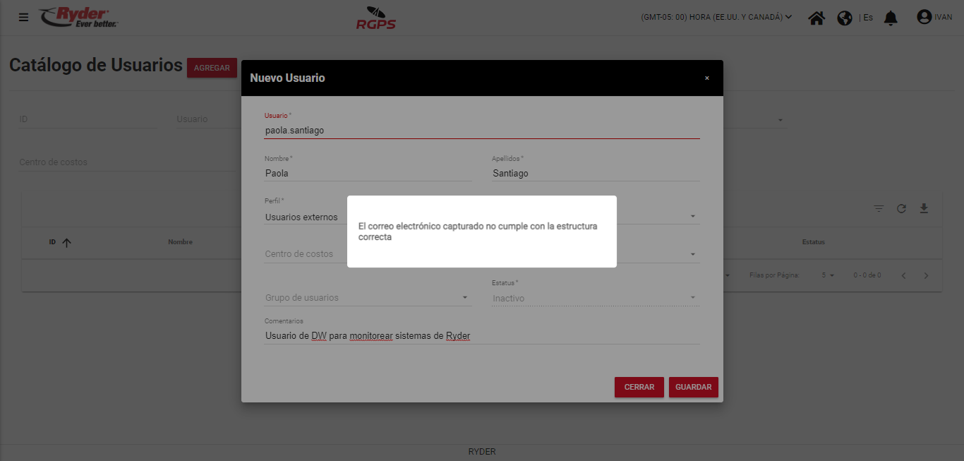 El mensaje desaparecerá de manera automática tras haber transcurrido un par de segundos y el usuario permanecerá en el modal “Nuevo Usuario”, en donde el campo [Usuario] se mostrará de color rojo.