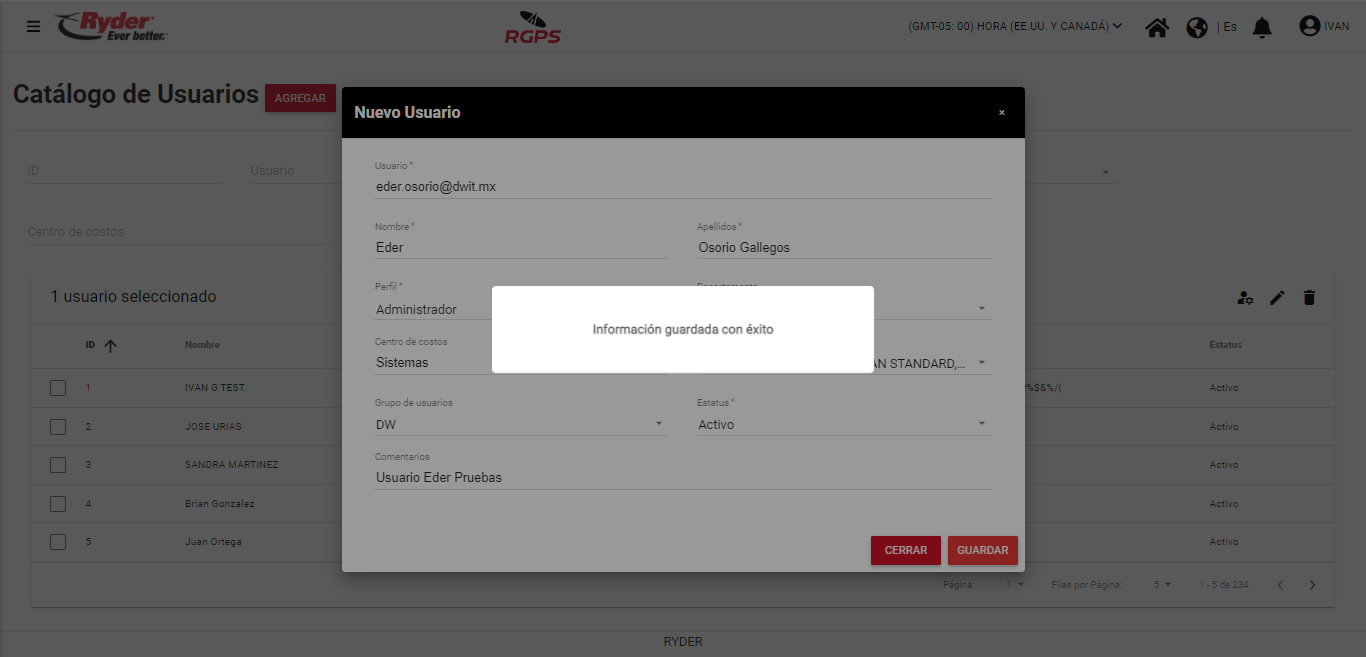 El mensaje desaparecerá de manera automática tras haber transcurrido un par de segundos y el usuario permanecerá en el modal “Nuevo Usuario” para realizar la verificación de lo capturado.