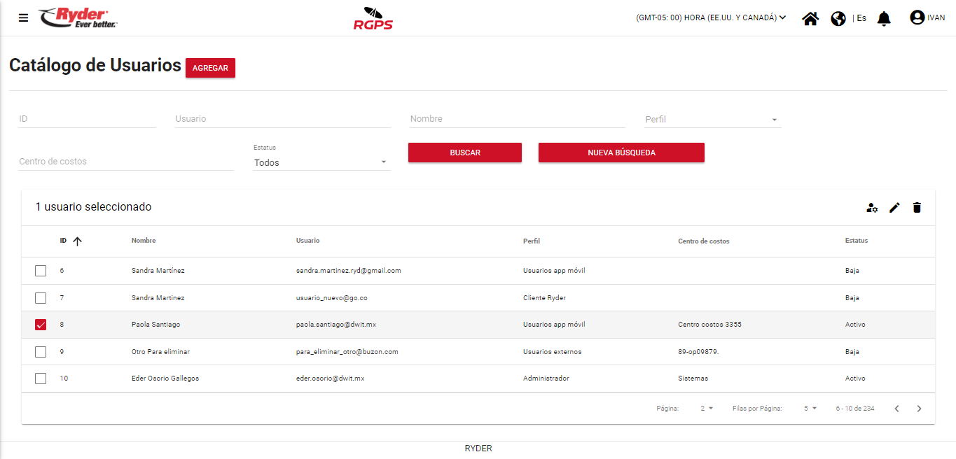 Al encontrarse en la pantalla “Catálogo de Usuarios” y haber aplicado una búsqueda, el usuario deberá habilitar la casilla del registro de su interés y se mostrarán del lado derecho de la tabla los iconos: Editar y Eliminar.
