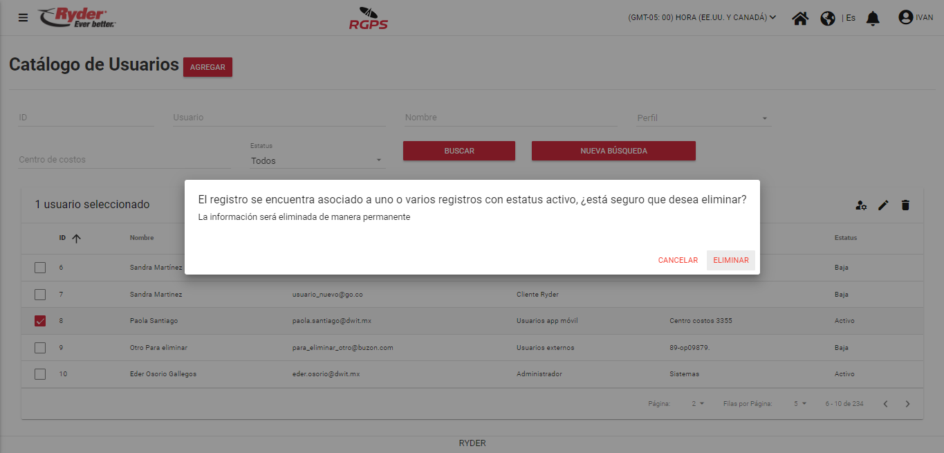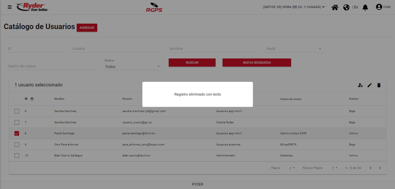 En cambio, si el usuario da clic en el botón [Eliminar], se mostrará mensaje de confirmación exitoso y el usuario permanecerá en la pantalla “Catálogo de Usuarios” en donde se mostrará el registro que fue eliminado con estatus “Baja”.