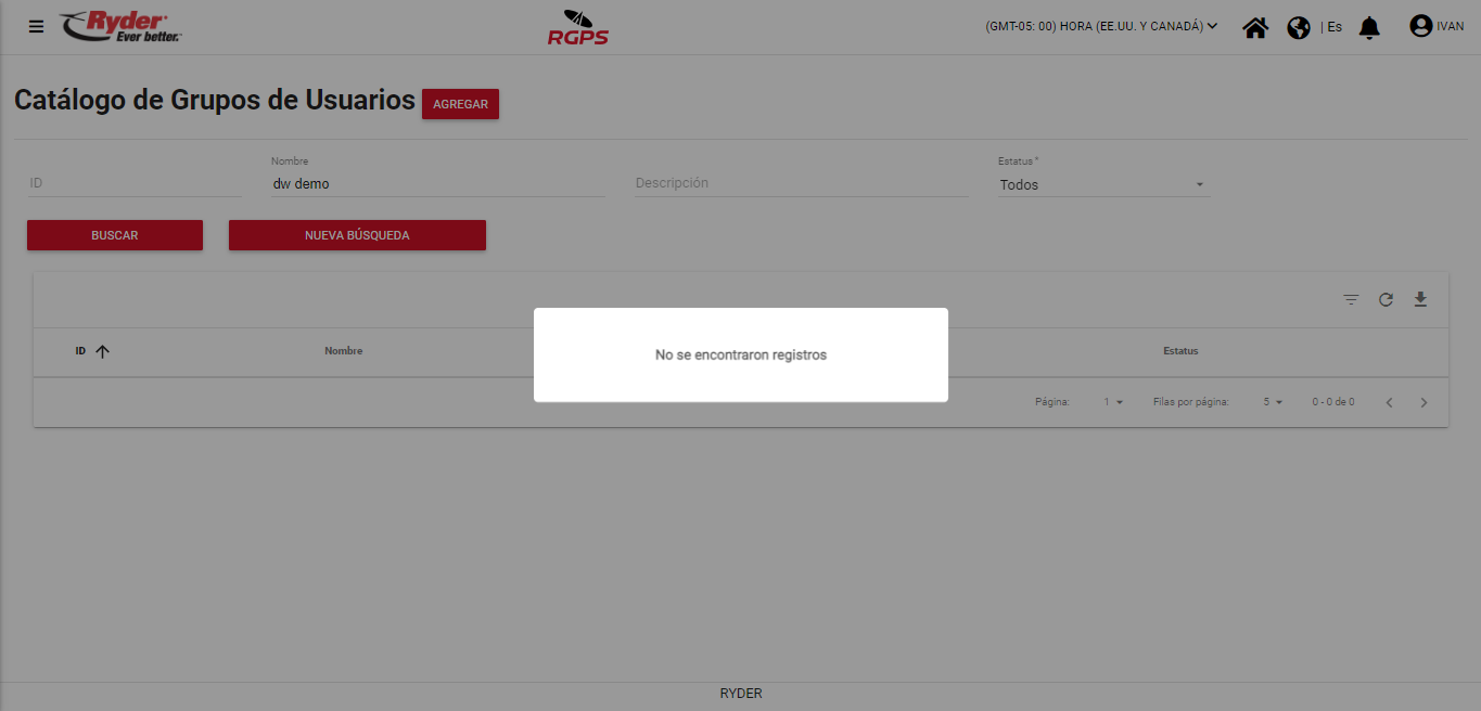 En caso de realizar la búsqueda de un grupo de usuarios que no se encuentre registrado en el sistema, al dar clic en el botón [Buscar] se mostrará el siguiente mensaje: “No se encontraron registros”. El mensaje desaparecerá de manera automática tras un par de segundos y el usuario permanecerá en la pantalla correspondiente donde se mostrará lo que fue capturado/seleccionado en los filtros correspondientes. El usuario podrá dar clic en el botón [Nueva búsqueda] para limpiar la información capturada/seleccionada y poder aplicar una nueva.