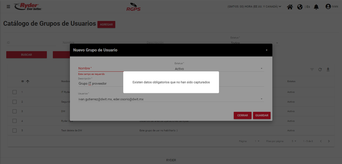 El mensaje desaparecerá de manera automática tras haber transcurrido un par de segundos y el usuario permanecerá en el modal “Nuevo Grupo de Usuario”, en donde los campos vacíos mostrarán de color rojo junto con la siguiente leyenda: “Este campo es requerido”.