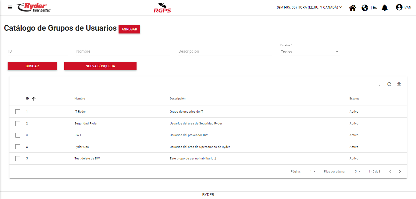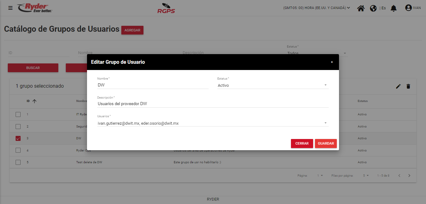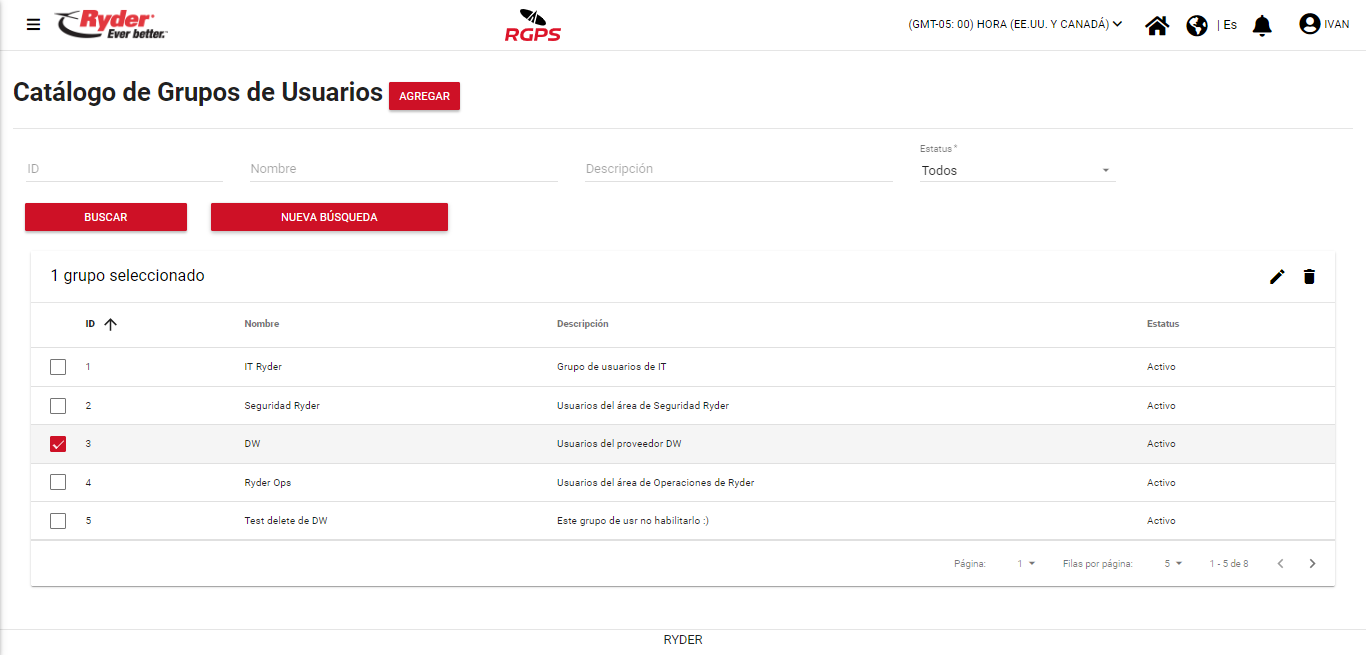 Al encontrarse en la pantalla “Catálogo de Grupos de Usuarios” y haber aplicado una búsqueda, el usuario deberá habilitar la casilla del registro de su interés y se mostrarán del lado derecho de la tabla los iconos: Editar y Eliminar.