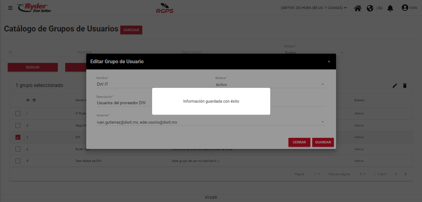 El mensaje desaparecerá de manera automática tras haber transcurrido un par de segundos y el usuario permanecerá en la pantalla “Catálogo de Grupos de Usuarios”, en donde ya no se mostrará seleccionado el registro y se visualizará las modificaciones realizadas si es que el dato que se editó se encuentra en las columnas del grid.