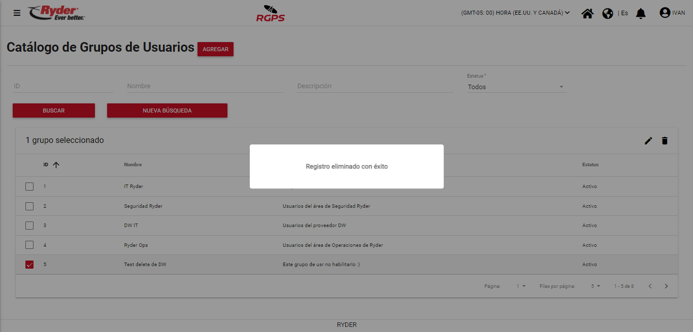 El mensaje desaparecerá de manera automática tras haber transcurrido un par de segundos y el usuario permanecerá en la pantalla “Catálogo de Grupos de Usuarios”, en donde ya no se mostrará seleccionado el registro y se visualizará el registro que fue eliminado con estatus “Baja”.