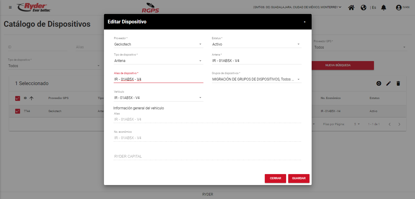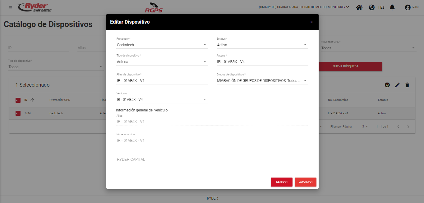 El usuario deberá dar clic en el icono [Editar] y se mostrará el modal “Editar Dispositivo”, en donde se mostrarán todos los datos que fueron capturados o seleccionados al momento de que se registró el dispositivo consultado.