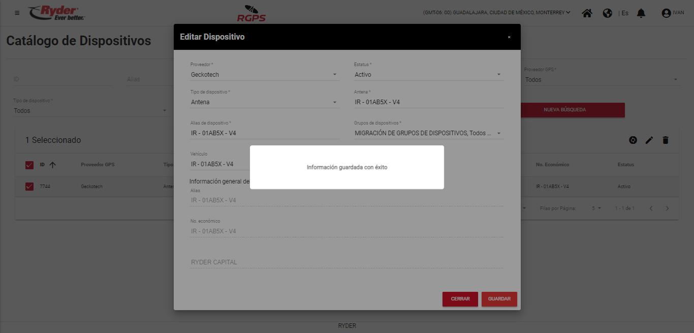 El mensaje desaparecerá de manera automática tras haber transcurrido un par de segundos y el usuario permanecerá en la pantalla “Catálogo de Dispositivos”, en donde ya no se mostrará seleccionado el registro y se visualizará las modificaciones realizadas si es que el dato que se editó se encuentra en las columnas del grid.