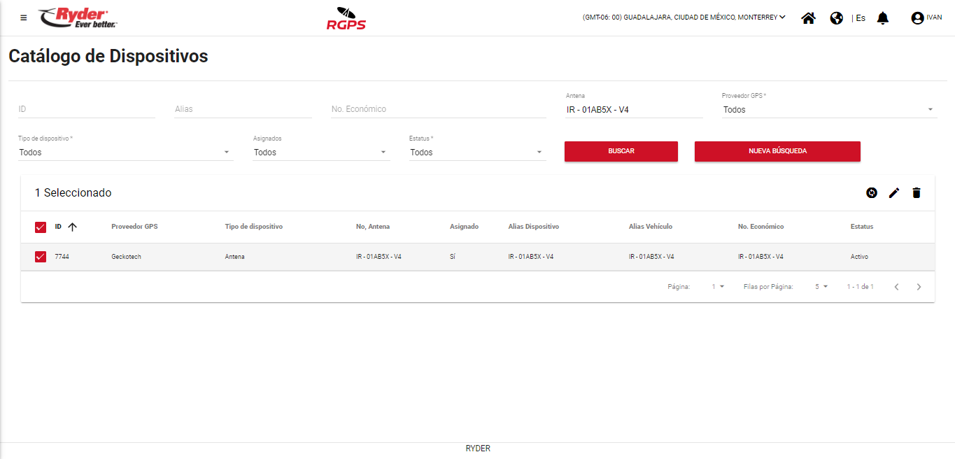 Al encontrarse en la pantalla “Catálogo de Dispositivos” y haber aplicado una búsqueda, el usuario deberá habilitar la casilla del registro de su interés y se mostrarán del lado derecho de la tabla los iconos: Desactivar/activar dispositivos, Editar y Eliminar.