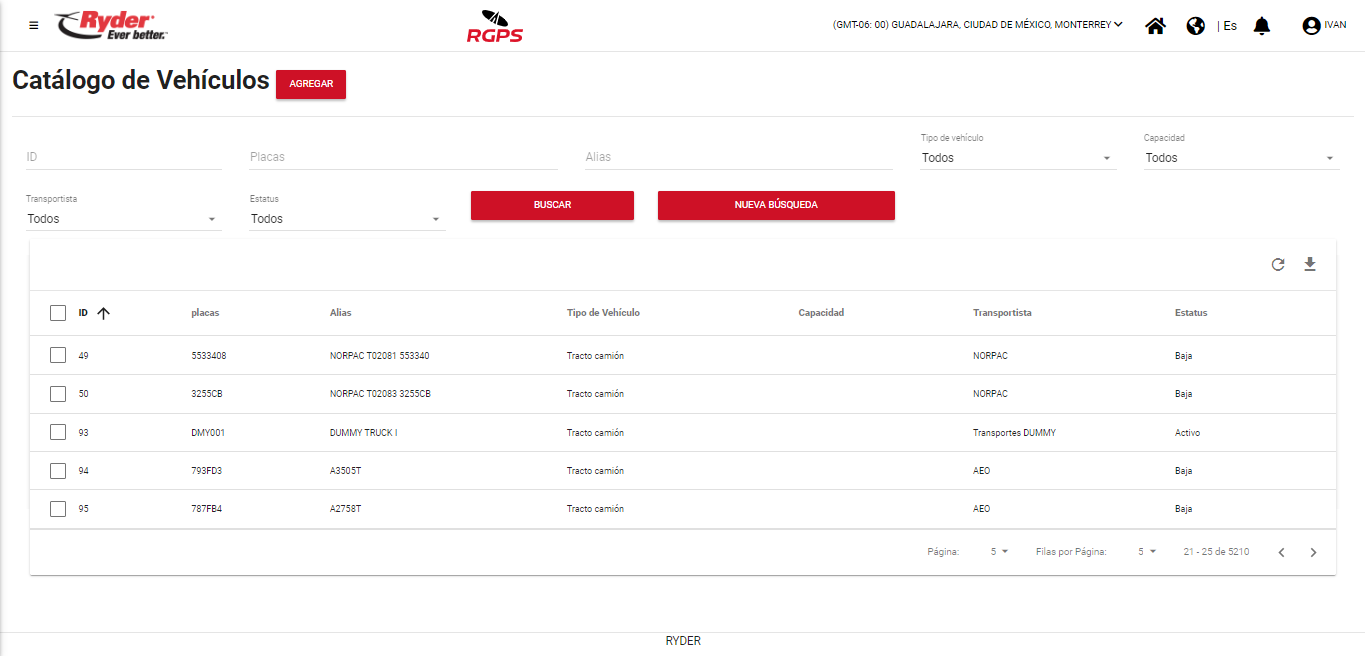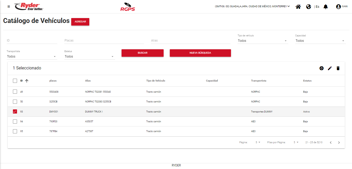 NOTA: El icono de "Activar vehículos" se mostrará en caso de que se realice la selección de uno o varios registros con estatus "Activo". Y el icono "Desactivar vehículos" se mostrará cuando se realice la selección de uno o más registros con estatus "Inactivo/Baja".