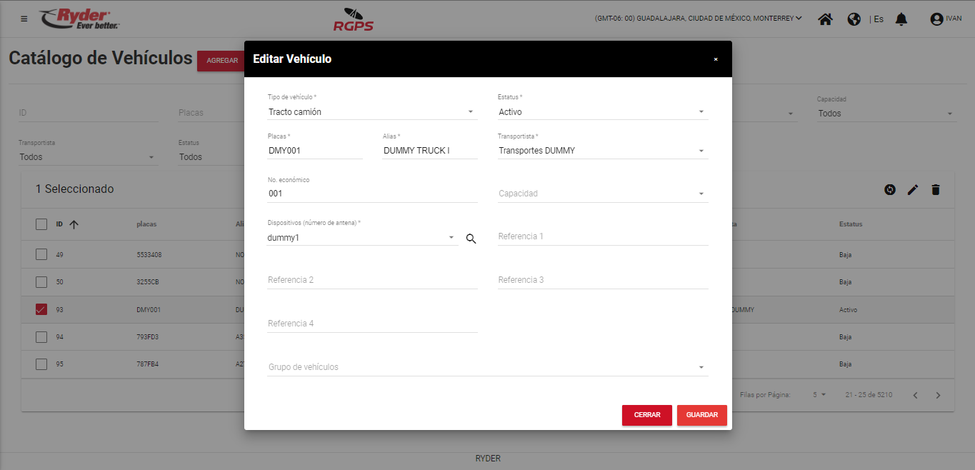 El usuario deberá dar clic en el icono [Editar] y se mostrará el modal “Editar Vehículo”, en donde se mostrarán todos los datos que fueron capturados o seleccionados al momento de que se guardó/editó el vehículo consultado.