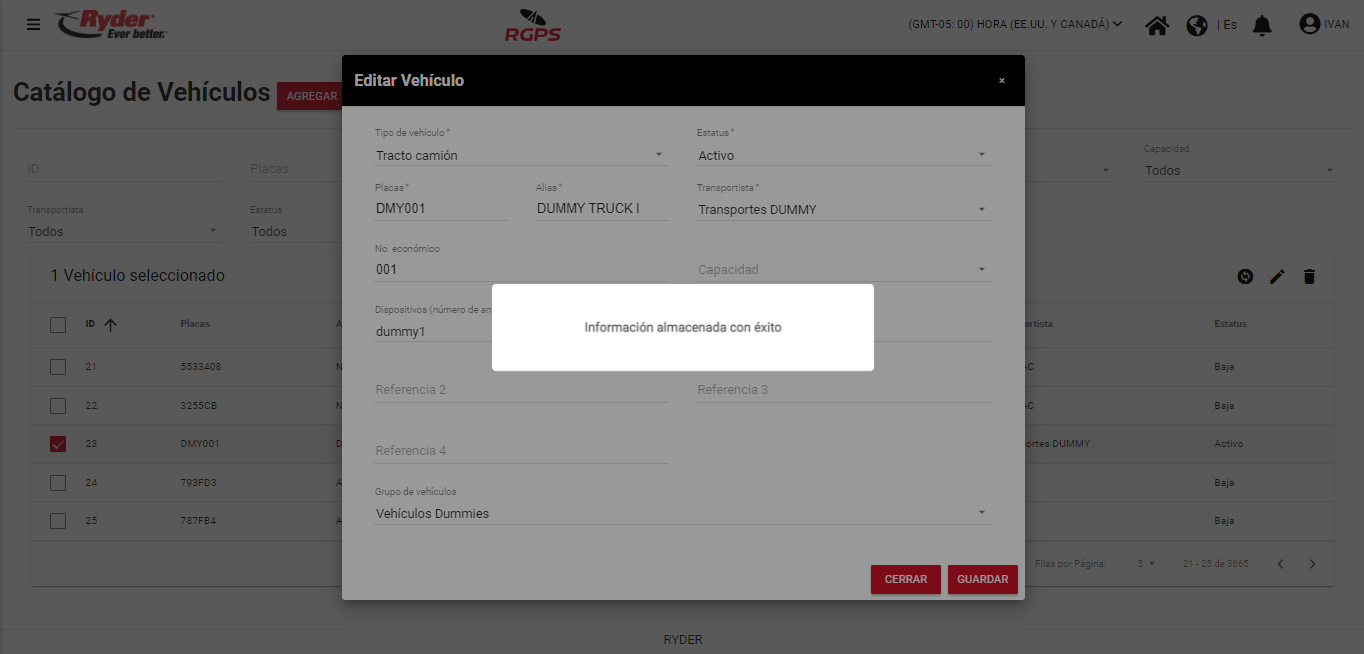 El mensaje desaparecerá de manera automática tras haber transcurrido un par de segundos y el usuario permanecerá en la pantalla “Catálogo de Vehículos”, en donde ya no se mostrará seleccionado el registro y se visualizará las modificaciones realizadas si es que el dato que se editó se encuentra en las columnas del grid.