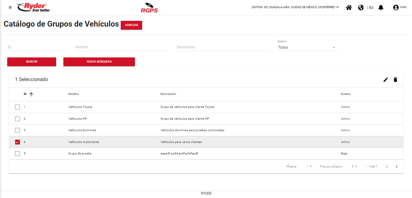 Al encontrarse en la pantalla “Catálogo de Grupos de Vehículos” y haber aplicado una búsqueda, el usuario deberá habilitar la casilla del registro de su interés y se mostrarán del lado derecho de la tabla los iconos: Editar y Eliminar.
