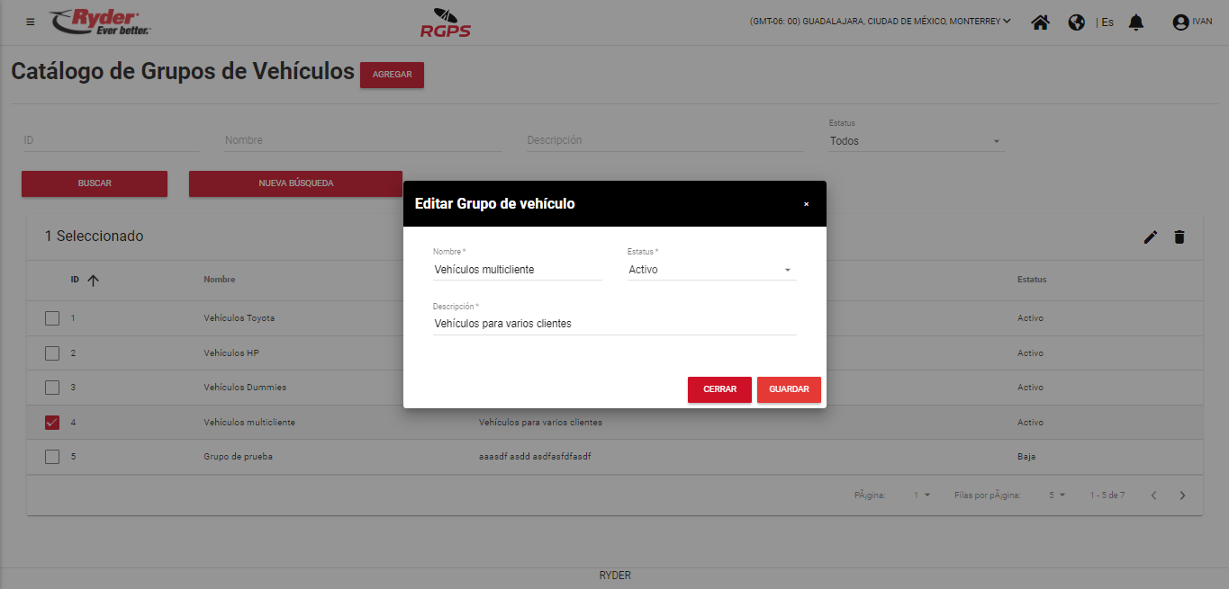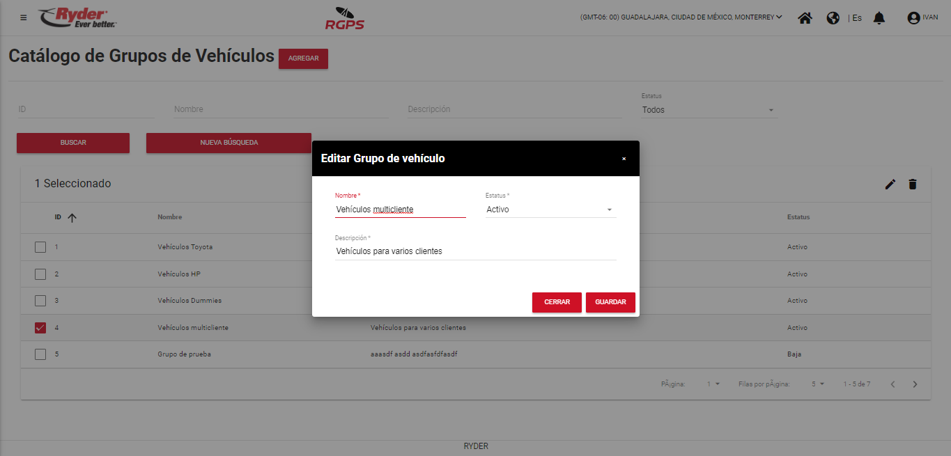 El usuario deberá dar clic en el icono [Editar] y se mostrará el modal “Editar Grupo de Vehículo”, en donde se mostrarán todos los datos que fueron capturados o seleccionados al momento de que se guardó/editó el grupo de vehículo consultado.