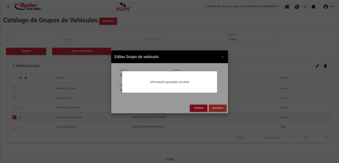 El mensaje desaparecerá de manera automática tras haber transcurrido un par de segundos y el usuario permanecerá en la pantalla “Catálogo de Grupos de Vehículos”, en donde ya no se mostrará seleccionado el registro y se visualizará las modificaciones realizadas si es que el dato que se editó se encuentra en las columnas del grid.