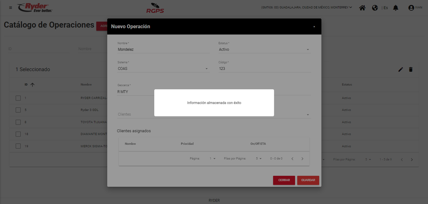 El mensaje desaparecerá de manera automática tras haber transcurrido un par de segundos y el usuario permanecerá en la pantalla “Catálogo de Operaciones”, en donde se podrá visualizar el nuevo registro dado de alta en el sistema.