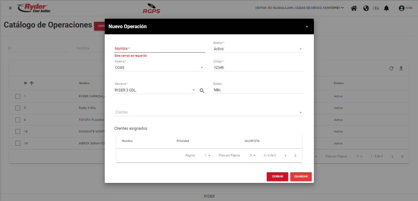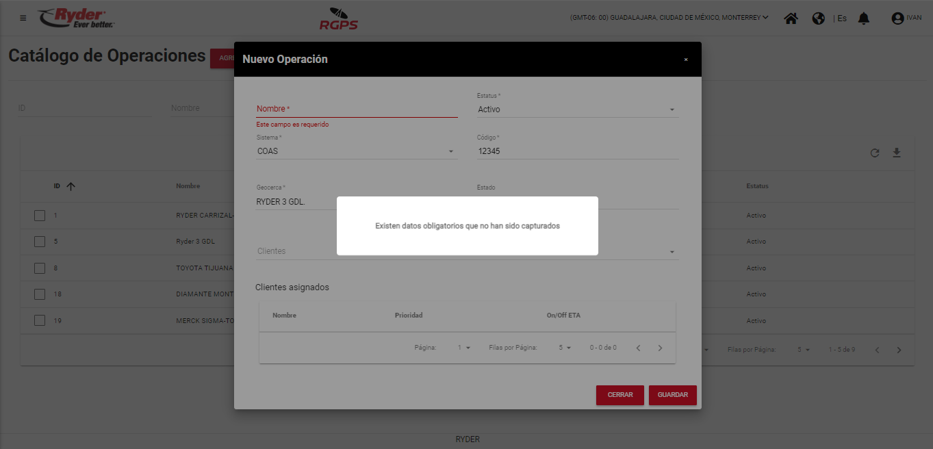 El mensaje desaparecerá de manera automática tras haber transcurrido un par de segundos y el usuario permanecerá en el modal “Nueva Operación”, en donde el campo [Nombre] se mostrará de color rojo.