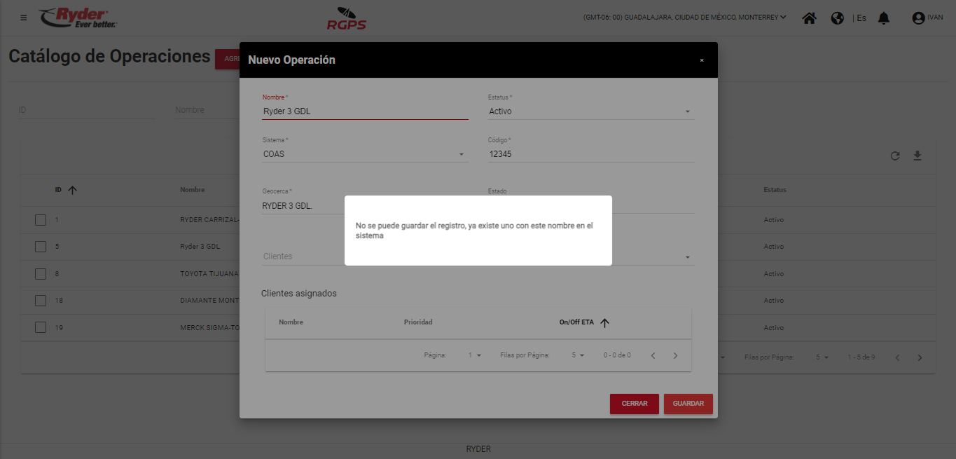 - El usuario realiza la captura del nombre de una operación que ya se encuentra registrada en el sistema, al dar clic en el botón [Guardar] se muestra el siguiente mensaje: “No se puede guardar el registro, ya existe uno con este nombre en el sistema”.