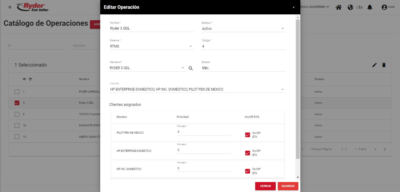 En caso de que no se deseé concluir con la edición de la operación seleccionada, el usuario deberá dar clic en el botón [Cerrar] y/o el icono “X” del modal “Editar Operación” y se cerrará el modal correspondiente, permaneciendo el usuario en la pantalla “Catálogo de Operaciones” en donde se visualizarán los resultados de la búsqueda aplicada junto con el registro seleccionado.