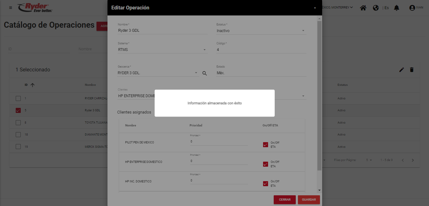 El mensaje desaparecerá de manera automática tras haber transcurrido un par de segundos y el usuario permanecerá en la pantalla “Catálogo de Operaciones”, en donde ya no se mostrará seleccionado el registro y se visualizará las modificaciones realizadas si es que el dato que se editó se encuentra en las columnas del grid.