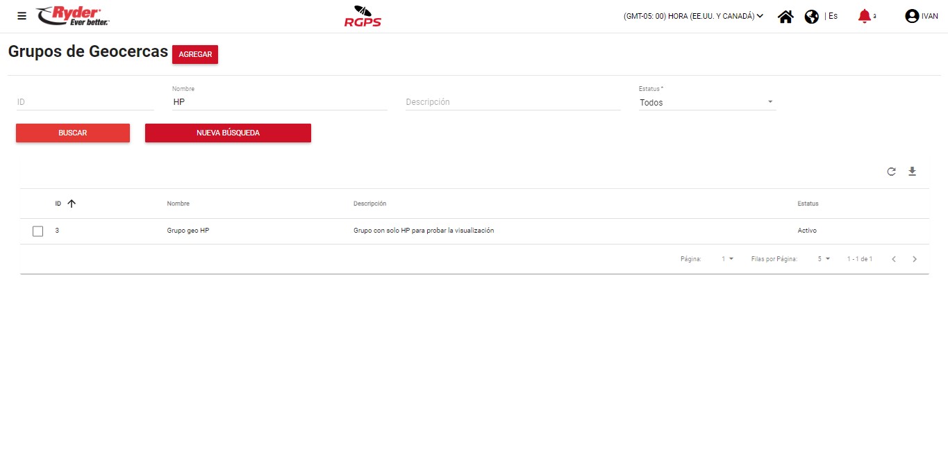 Al finalizar la captura/selección del filtro de interés, el usuario deberá dar clic en el botón [Buscar] y se mostrará el listado de todos aquellos grupos de geocercas registrados que coincidan de manera total o parcial con el filtro aplicado.