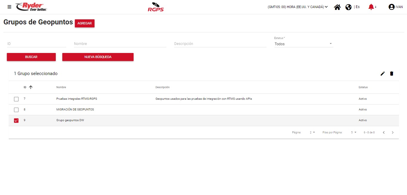 Al encontrarse en la pantalla “Grupos de Geopuntos” y haber aplicado una búsqueda, el usuario deberá habilitar la casilla del registro de su interés y se mostrarán del lado derecho de la tabla los iconos: Editar y Eliminar.