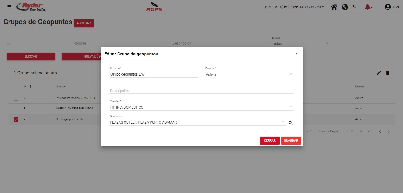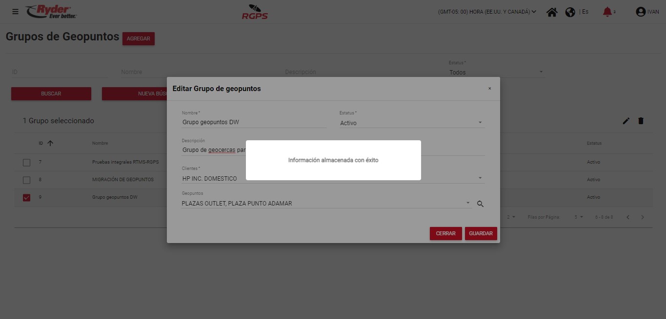 El mensaje desaparecerá de manera automática tras haber transcurrido un par de segundos y el usuario permanecerá en la pantalla “Grupos de Geopuntos”, en donde ya no se mostrará seleccionado el registro y se visualizará las modificaciones realizadas si es que el dato que se editó se encuentra en las columnas del grid.