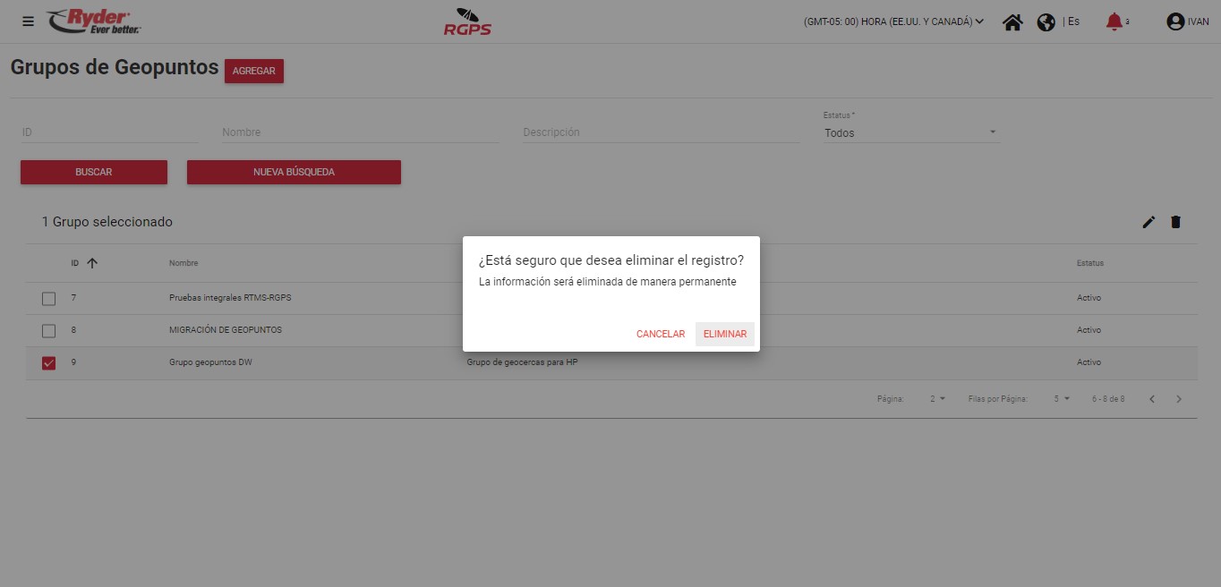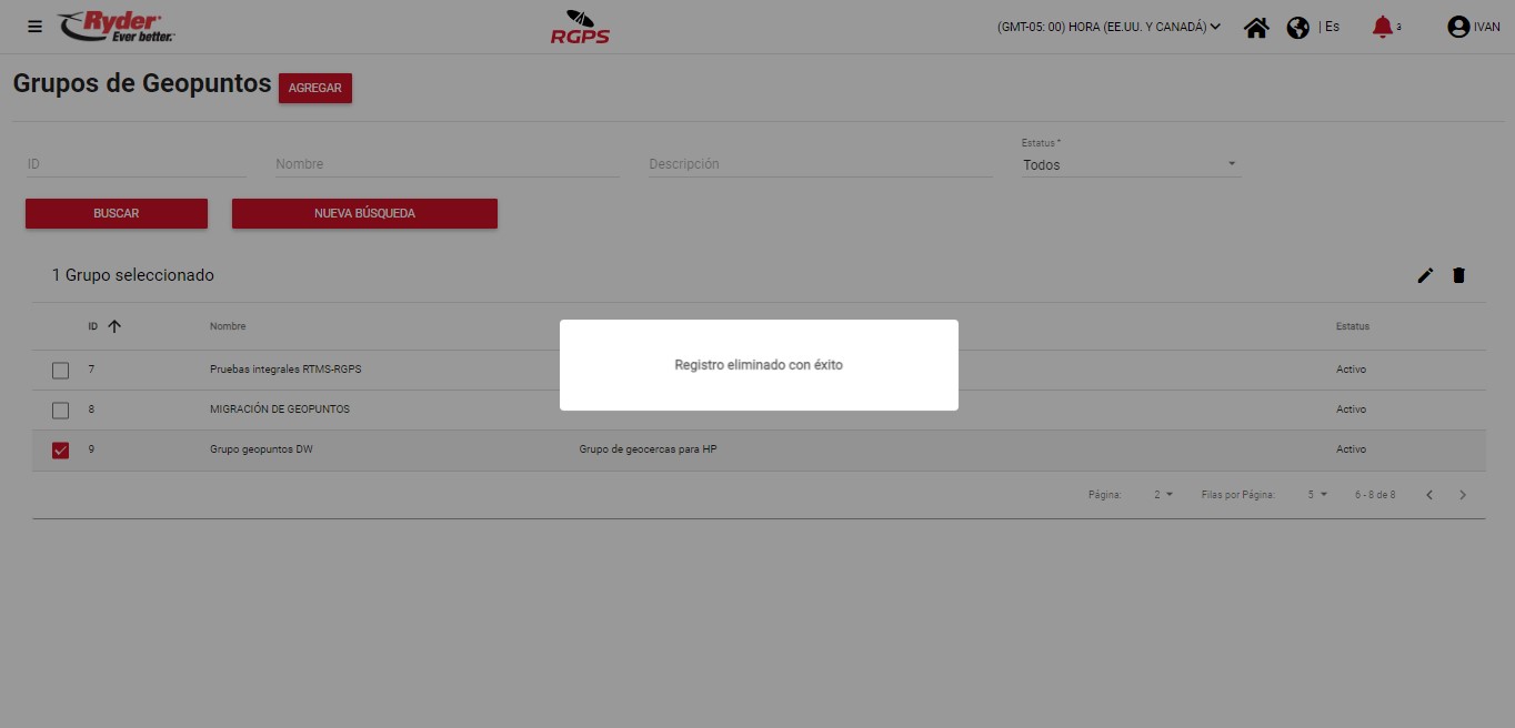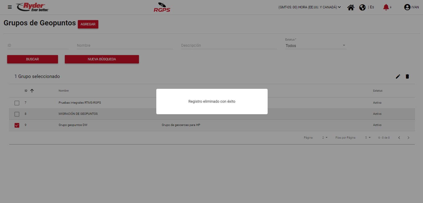 El mensaje desaparecerá de manera automática tras haber transcurrido un par de segundos y el usuario permanecerá en la pantalla “Grupos de Geopuntos”, en donde ya no se mostrará seleccionado el registro y se visualizará el registro que fue eliminado con estatus “Baja”.