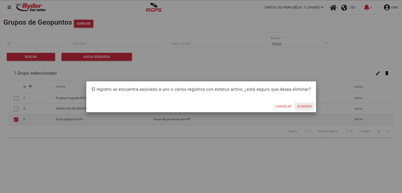 Existen motivos por los cuales un usuario no podrá realizar la eliminación exitosa de un grupo de geopunto, de los cuales se encuentra el siguiente: