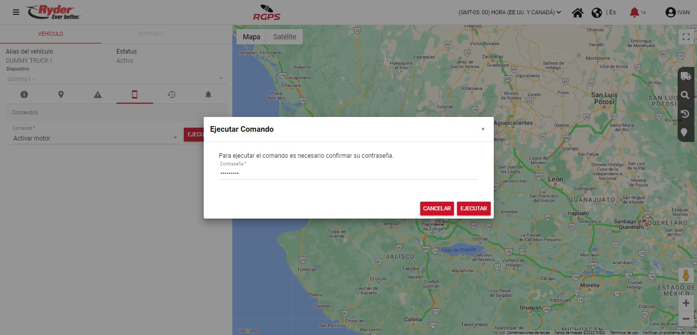 Al finalizar la selección del comando de interés, el usuario deberá dar clic en el botón [Ejecutar] y se mostrará modal "Ejecutar comando" en donde se solicitará al usuario realizar la captura de su contraseña de acceso. En caso de que el usuario no deseé realizar o concluir la ejecución del comando, deberá dar clic en el botón [Cancelar] y/o en el icono "X" del modal y el usuario permanecerá en la pestaña de comandos.