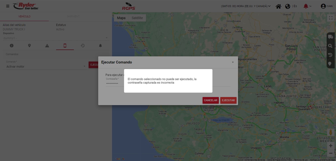 Si la contraseña captura es incorrecta al dar clic en el botón [Ejecutar] se mostrará el siguiente mensaje: "El comando seleccionado no puede ser ejecutado, la contraseña capturada es incorrecta". El mensaje desaparecerá de manera automática tras un par de segundos y el usuario podrá realizar nuevamente la captura de la contraseña.