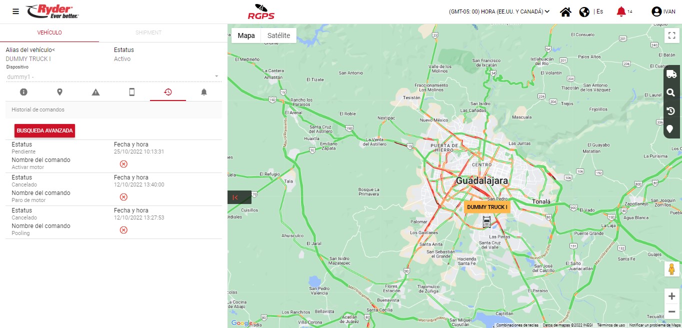 Al encontrarse el usuario en la barra lateral izquierda de detalle de la unidad sobre la cual se dio clic, el usuario deberá dar clic en el icono "Comandos" (Cuarto icono de izquierda a derecha). El usuario deberá dar clic en el campo "Comandos" y se desplegará listado con las siguientes opciones: Pooling, Paro de motor y Activar motor.