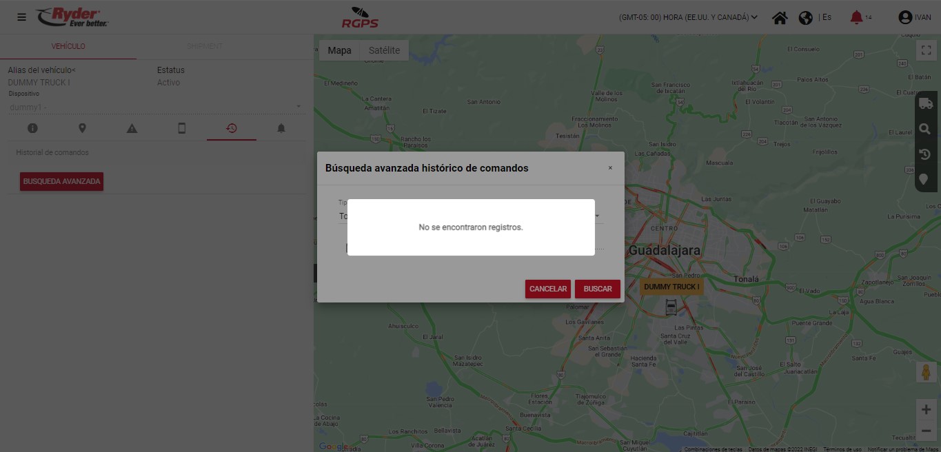 En caso de que no se encuentren ningún comando que coincida con los filtros aplicados, al dar clic en el botón [Buscar] se mostrará el siguiente mensaje: "No se encontraron registros".