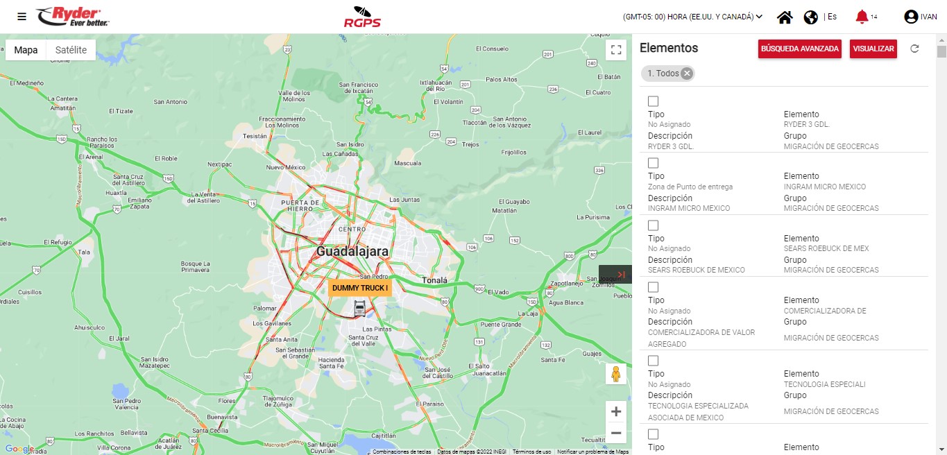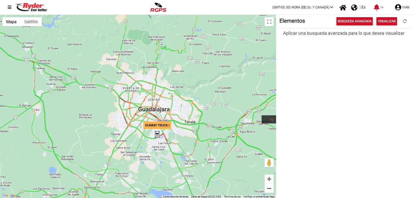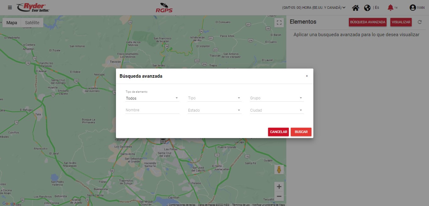 Al encontrarse en la pantalla de "Monitor de unidades", el usuario deberá ubicar los iconos posicionados del lado derecho del mapa y dar clic en la opción "Elementos". Al dar clic, se desplegará del lado derecho una barra lateral para realizar una búsqueda avanzada de elementos.