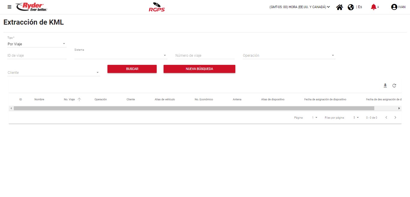 El usuario deberá dar clic sobre la opción [KML] y se mostrará la pantalla “Extracción de KML” en donde se visualizará el listado vacío hasta que el usuario aplique una búsqueda en los filtros y/o accione al botón [Buscar] sin haber aplicado un filtro.