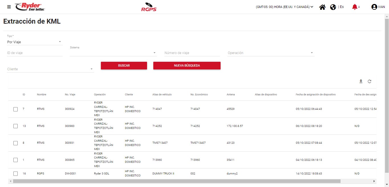 Si el usuario da clic en el botón [Buscar] se mostrará el listado de los recorridos de KML que se encuentren registrados en el sistema con el tipo "Viaje" ya que es el seleccionado por default, mostrándose de cada registro los siguientes datos: