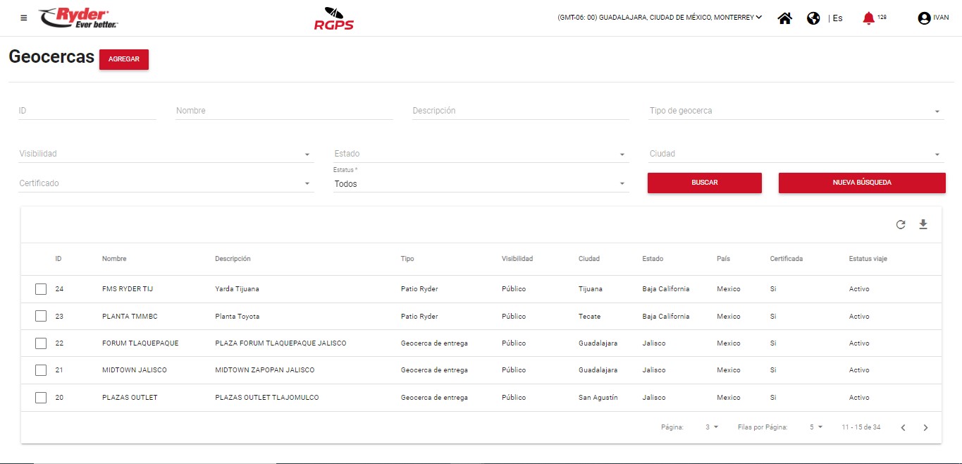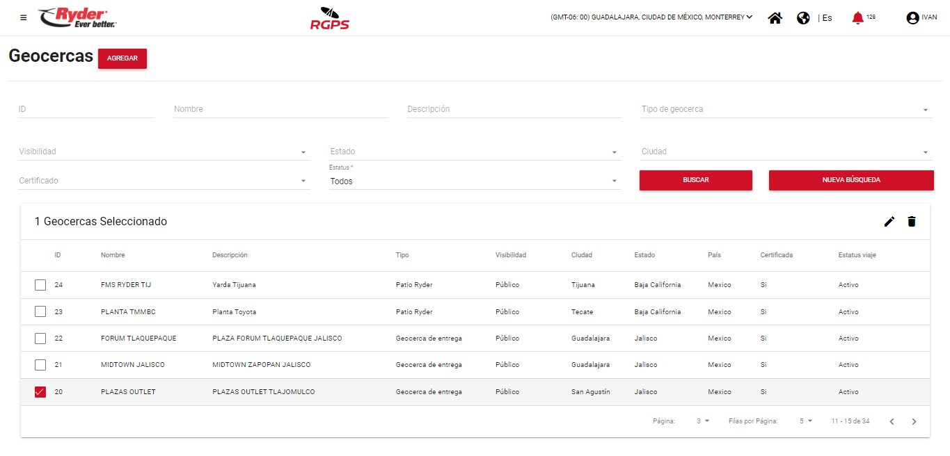 Al encontrarse en la pantalla “Geocercas” y haber aplicado una búsqueda, el usuario deberá habilitar la casilla del registro de su interés y se mostrarán del lado derecho de la tabla los iconos: Editar y Eliminar.