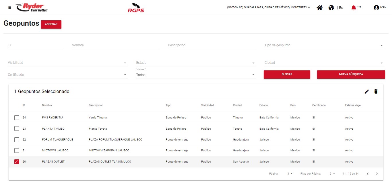 Al encontrarse en la pantalla “Geopuntos” y haber aplicado una búsqueda, el usuario deberá habilitar la casilla del registro de su interés y se mostrarán del lado derecho de la tabla los iconos: Editar y Eliminar.