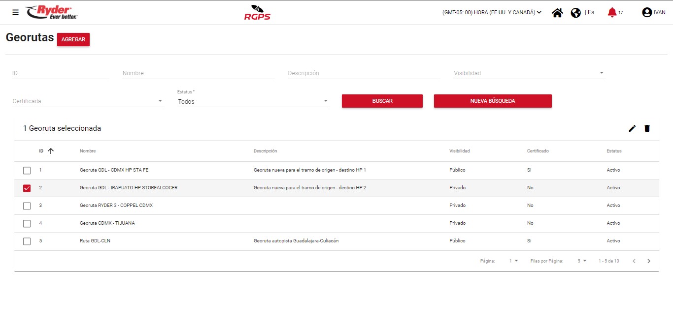 Al encontrarse en la pantalla “Georutas” y haber aplicado una búsqueda, el usuario deberá habilitar la casilla del registro de su interés y se mostrarán del lado derecho de la tabla los iconos: Editar y Eliminar.