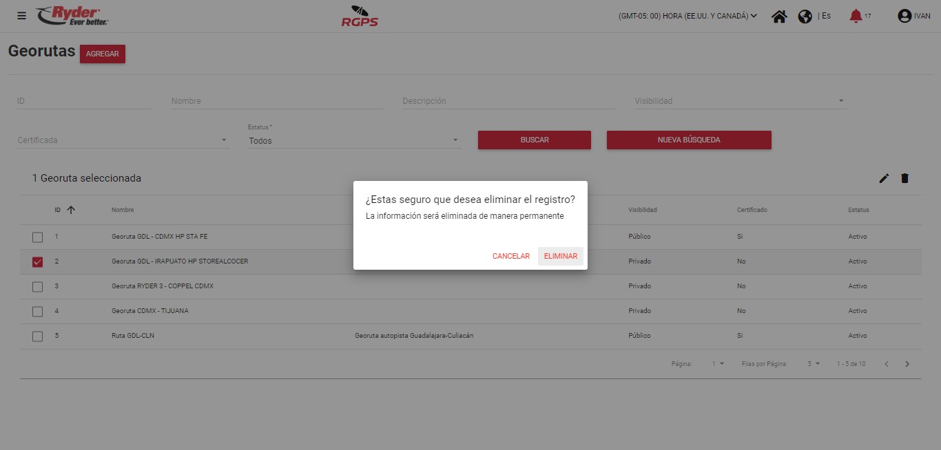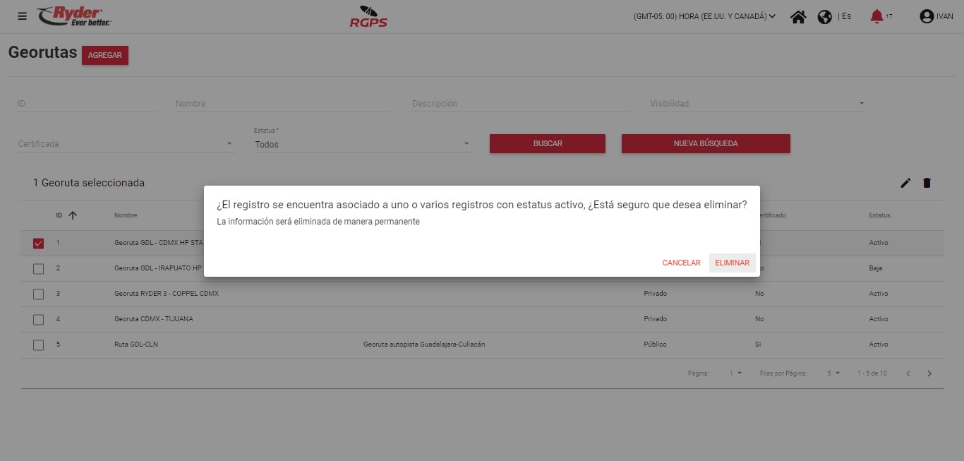 Existen motivos por los cuales un usuario no podrá realizar la eliminación exitosa de una georuta, de los cuales se encuentra el siguiente: