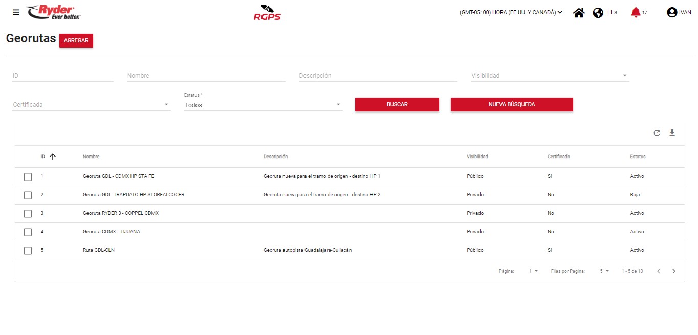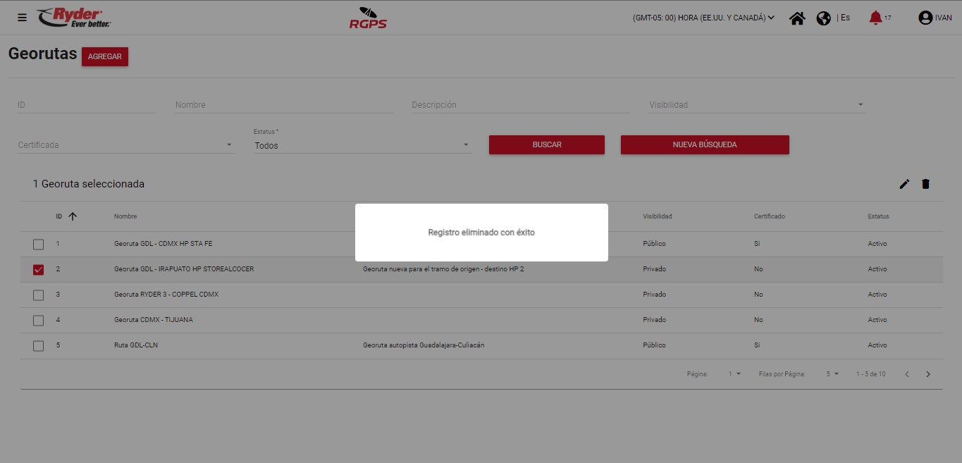 El mensaje desaparecerá de manera automática tras haber transcurrido un par de segundos y el usuario permanecerá en la pantalla “Georutas”, en donde ya no se mostrará seleccionado el registro y se visualizará el registro que fue eliminado con estatus “Baja”.