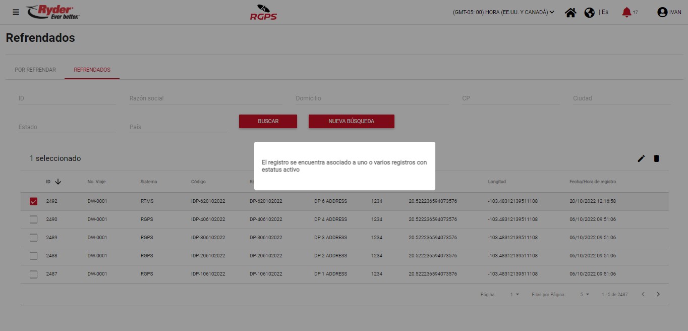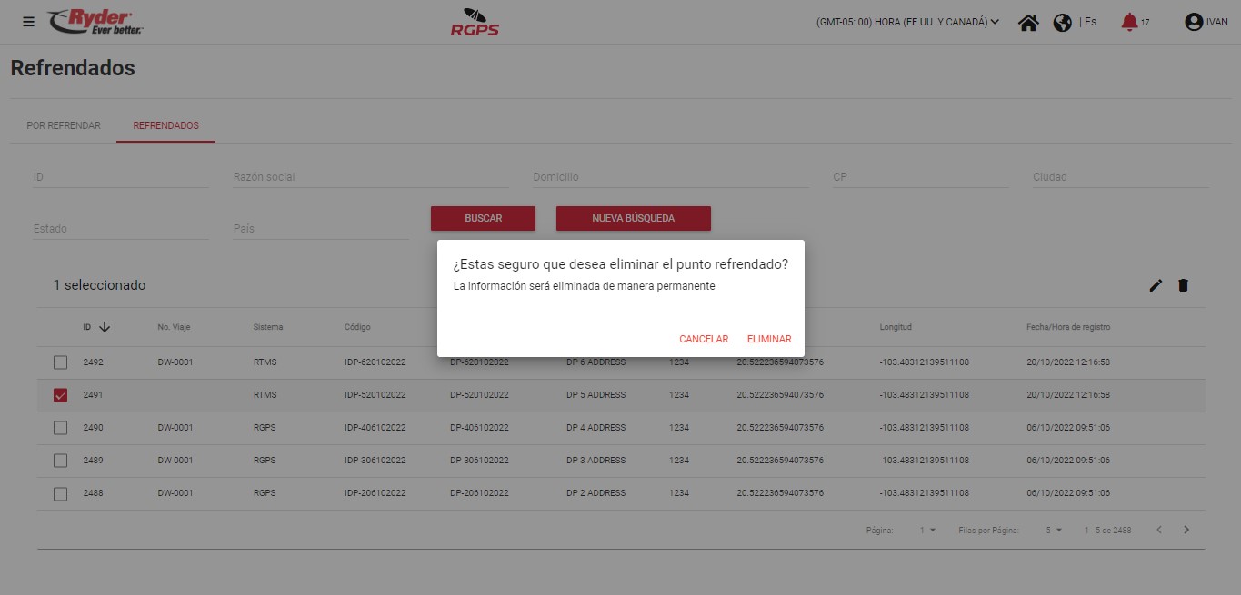 En caso de que no se deseé concluir con la eliminación del punto de entrega refrendado seleccionado, el usuario deberá dar clic en el botón [Cancelar] y se cerrará el mensaje mostrado en pantalla, permaneciendo el usuario en la pantalla “ Refrendados” en donde se visualizarán los resultados de la búsqueda aplicada junto con el registro seleccionado.