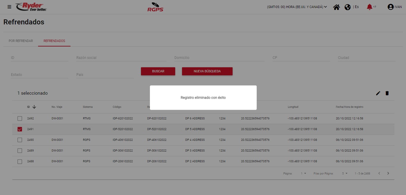 El mensaje desaparecerá de manera automática tras haber transcurrido un par de segundos y el usuario permanecerá en la pantalla “Refrendados” en la pestaña "Refrendados", en donde ya no se mostrará el punto de entrega refrendado que fue eliminado. Dicho punto de entrega podrá ser consultado nuevamente en la pestaña "Por refrendar" y refrendarlo nuevamente en el momento que el usuario deseé.
