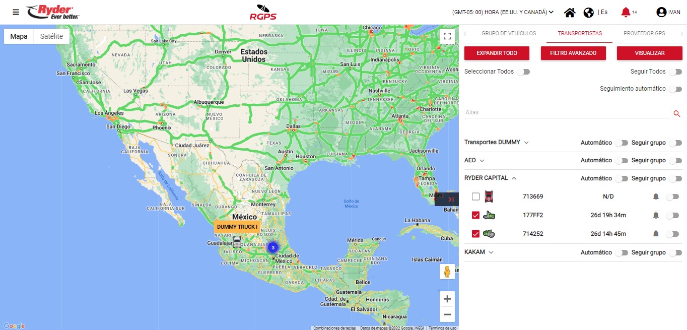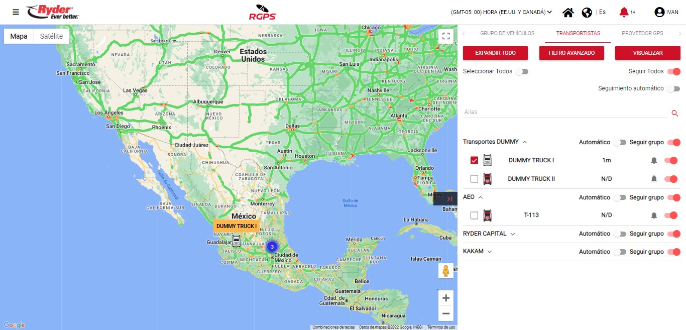 Al encontrarse en la pantalla de "Monitor de unidades", el usuario deberá ubicar los iconos posicionados del lado derecho del mapa y dar clic en la opción "Buscar". Al dar clic, se desplegará del lado derecho una barra lateral que contendrá el listado de las unidades asignadas al usuario autenticado en el portal mostrándose agrupadas en Grupo de vehículos, Transportistas y Proveedor GPS.