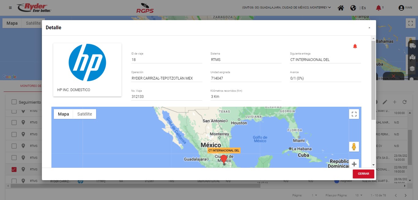 El usuario podrá dar clic en el botón [Cerrar] y/o dar clic en el icono [X] del modal "Detalle" y el usuario permanecerá en la pantalla "Monitor de viajes".